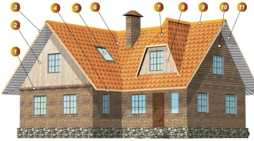 1 – карниз; 2 – фронтон; 3 – свес фронтона; 4 – свес карниза; 5 – мансардное окно; 6 – ендова; 7 – вальмовый скат; 8 – слуховое окно; 9 – конёк крыши; 10 – щипец; 11 – подшивка свеса (софит).