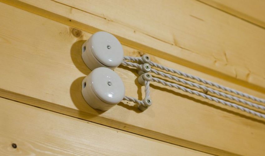 Монтаж проводки на изоляторах (например, ретро-проводка) распространенное решение в деревянном доме из оцилиндрованного бревна. К стене сначала крепят пластиковые или керамические изоляторы, а на них устанавливают двойной витой шнур.