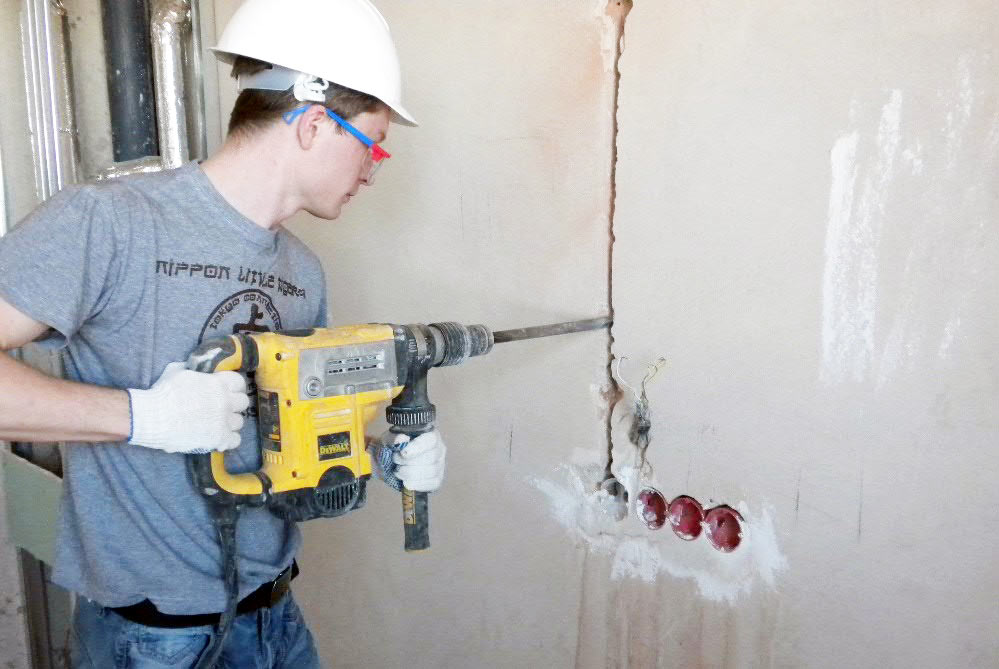 - Проделываем в стене нишу под розетку. Для этого используем электродрель или молоток с зубилом. Тип выбранного инструмента напрямую зависит от материала стены.