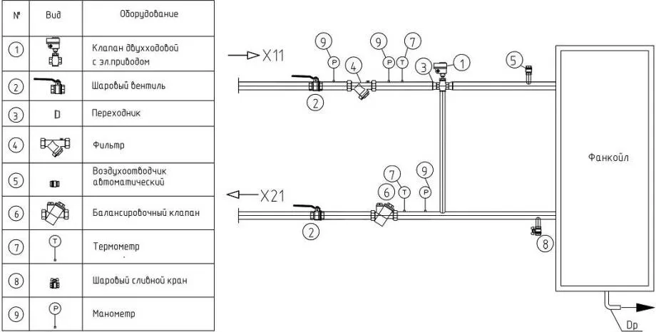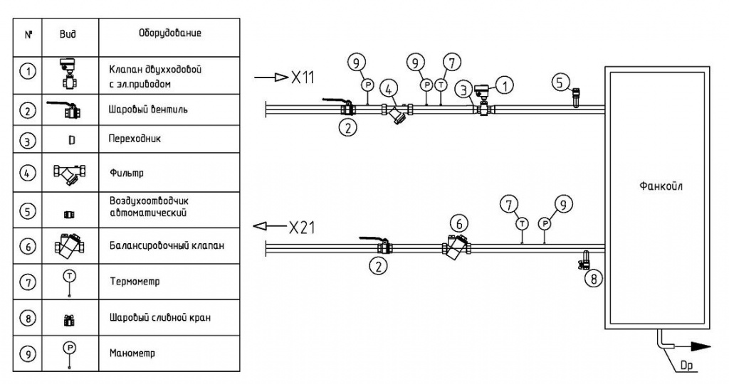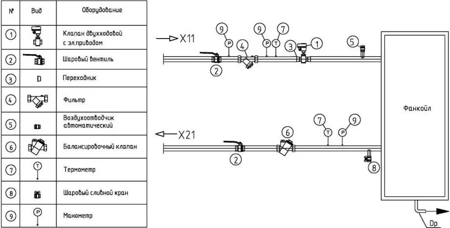 Обвязка фанкойла применяется для возможности подачи хладо/теплоносителя, поступающего в фанкойл, а также для регулирования расхода хладо/теплоносителя, поступающего в каждый отдельный фанкойл системы.
