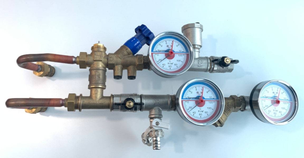 Дополнительно смесительные узлы могут комплектоваться измерительными приборами для контроля температура и давление теплоносителя. Обвязку располагают по ситуации слева или справа от фанкойла, компонуют ее элементы горизонтально или вертикально во время монтажа. Применение в смесительных узлах трехходовых клапанов с пружинным возвратным механизмом позволяет минимизировать риск аварий при внезапных отключениях электроэнергии, т.к. привод при помощи пружины возвращает клапан в исходное положение, перекрывая подачу теплоносителя к потребителю.