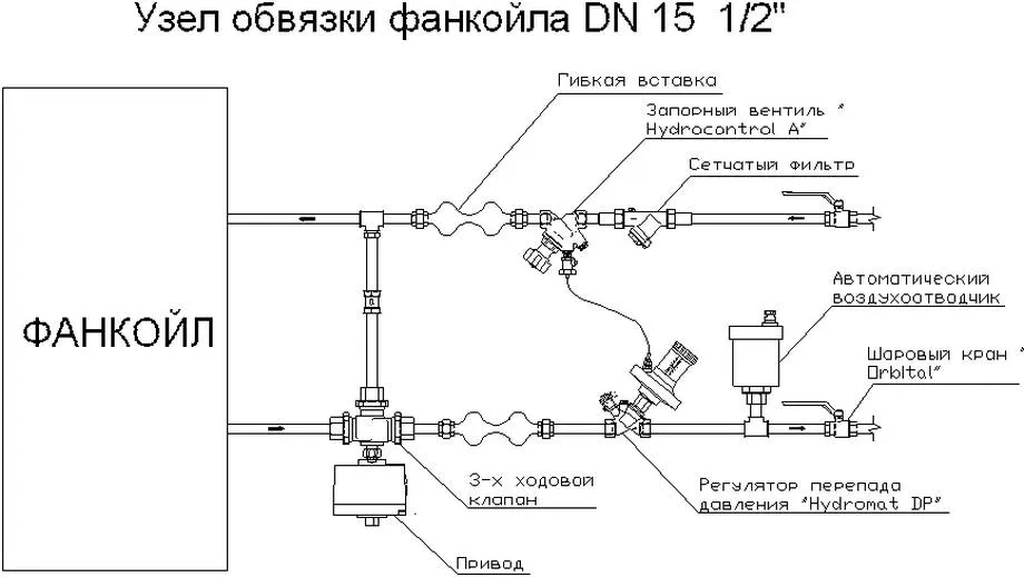 В схему обвязки фанкойла входят все возможные датчики и приспособления, которые ставятся на входе и на выходе из фанкойла. Основным элементом, без которого теряется сам смысл обвязки, является трехходовой клапан.