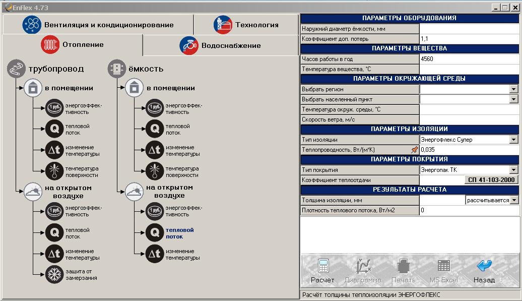 - Расчет отопления в зависимости от текущих параметров здания (тепловые потери), типа энергоносителя (газ, твердое топливо, дизель и т.д.). Также вычисляется требуемая мощность теплоснабжения для каждого помещения в здании.