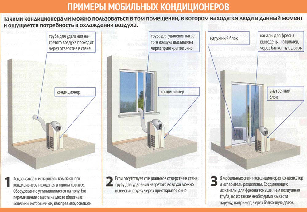 В мобильных сплит-системах конденсатор с испарителем расположены отдельно друг от друга. Соединяются они между собой при помощи трубок, которые транспортируют фреон. Каналы для перемещения фреона намного меньше по диаметру, чем воздушные трубы, поэтому вывести их наружу не составит большого труда. Работа данных кондиционеров не осложняется влиянием теплого воздуха, т.к. конденсатор устанавливается за пределами охлаждаемой комнаты.