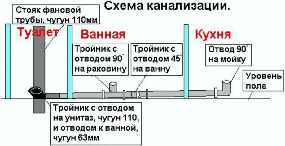- диаметр трубы 110 мм для унитаза, 50 мм для горизонтальных линий, вертикальных участков;