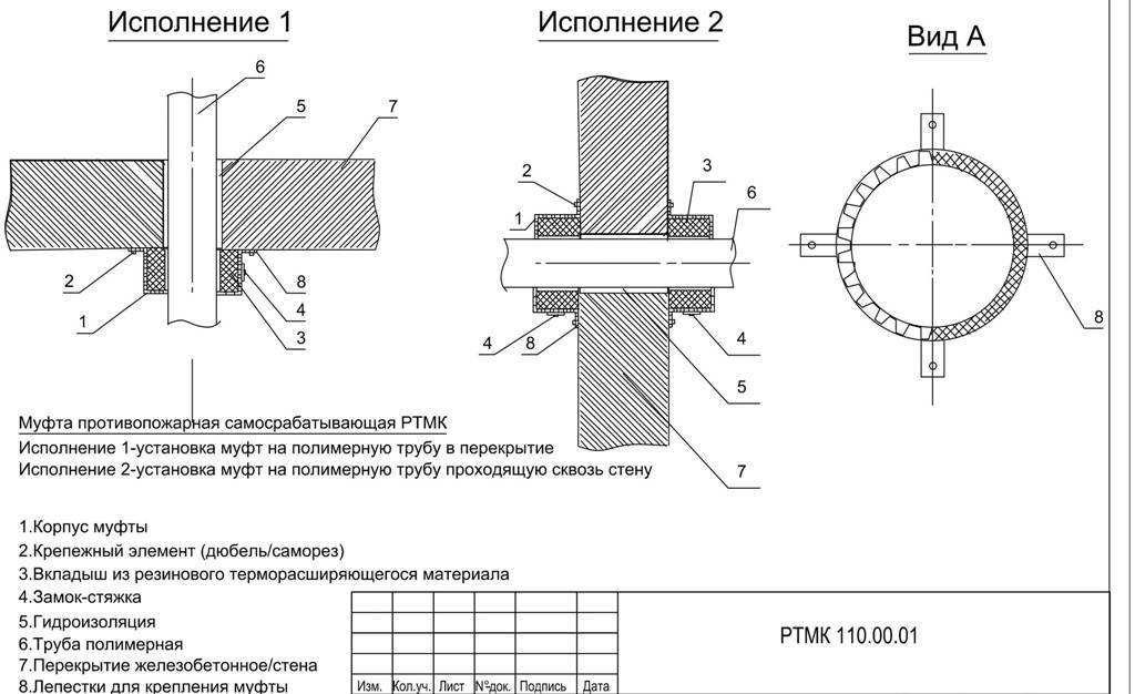 Допускается установка любых ППМ, частично заходящих внутрь проема. Тогда из стены либо из перекрытия выходит только верхушка корпуса. В таких случаях обязательно должно производиться насыщение раствором бетона, штукатуркой по мокрой технологии либо стойкой к огню пеной. Дополнительным требованием является отказ от прижатия к корпусу крепежей в подобной схеме исполнения. Это позволит повысить общую надежность и жесткость конструкции. Все виды муфт и манжет, отвечающие установленным стандартам, могут быть смонтированы и по вертикали, и по горизонтали, и под наклоном.