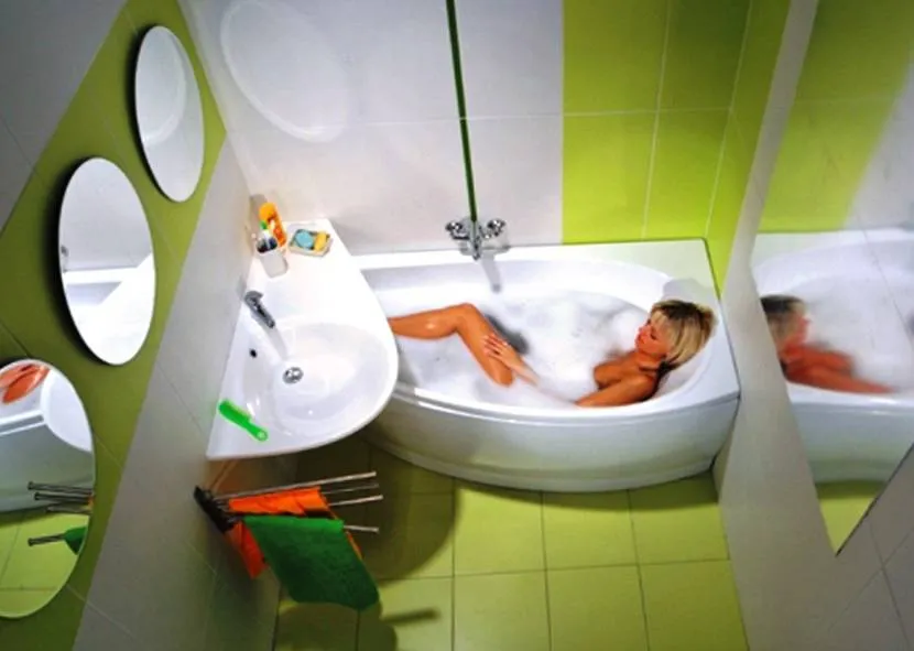 Угловая акриловая ванна позволяет сэкономить место в ванной комнате;