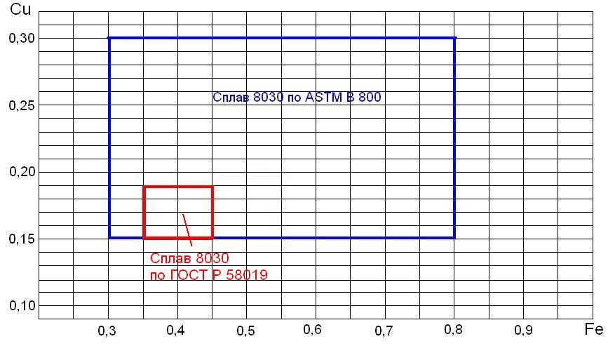 Отметим, что российские сплавы 8030 и 8176 существенно отличаются от своих американских и европейских аналогов (см. таблицы 4-6). На рисунках 7 и 8 показаны пределы содержания основных легирующих элементов в сплаве 8030 (железо-медь) и 8176 (железо-кремний) по ASTM B 800 и по ГОСТ Р 58019. Российские сплавы имеют значительно более низкое содержание легирующих элементов – железа, меди и кремния.