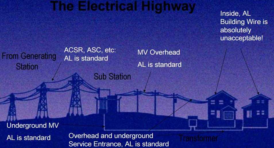 В презентации компании Alcan представлена наглядная схема стандартного применения алюминиевых проводов и кабелей для передачи электроэнергии от электростанций к жилым домам (рисунок 10) : везде, но не внутри самих домов!