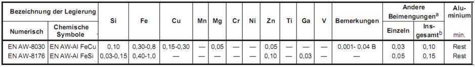Таблица 5 – Сплавы 8030 и 8176 в EN 573-3