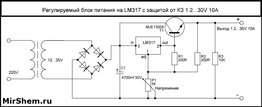 Данное устройство сделано из минимального количества недорогих деталей. Так как стабилизатор LM317T способен выдержать ток не более 1,5 А, то в конструкции используется транзистор MJE13009, благодаря которому на выходе можно получить ток равный 10 А.