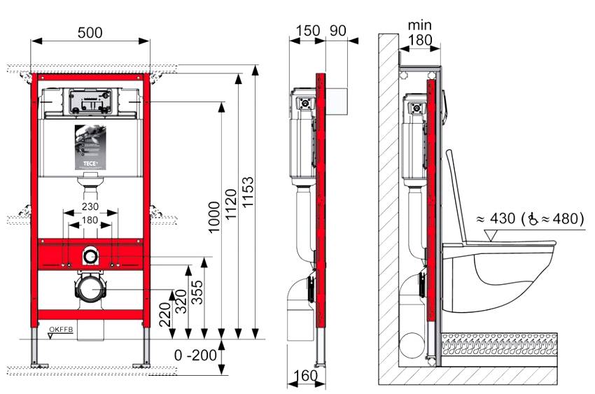 Минимальные размеры инсталляции для унитаза блочного типа обычно не сильно отличаются от рамных конструкций: глубина в этом случае составляет 10-15 см, высота – 1 м