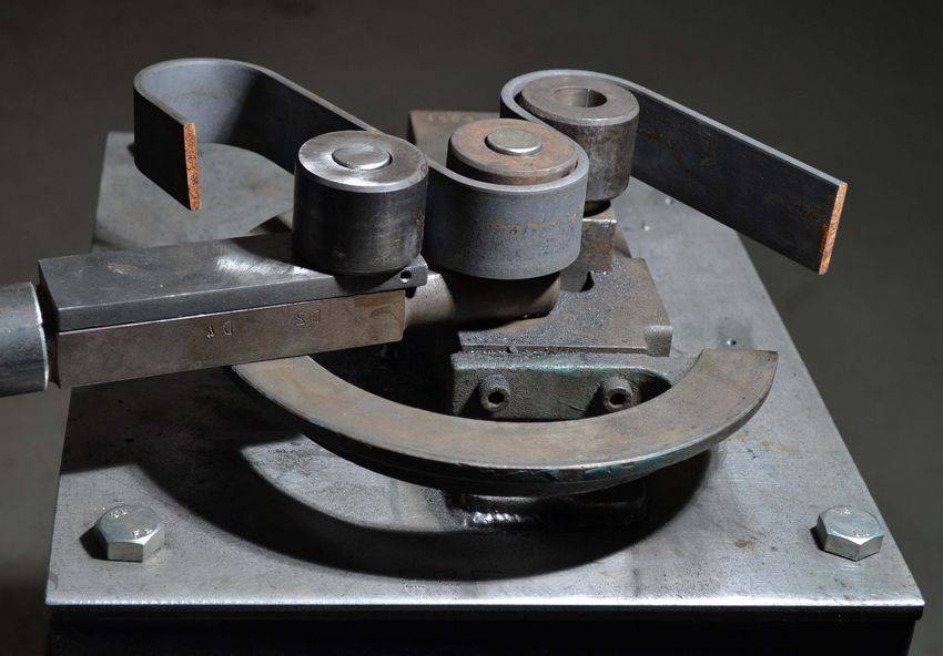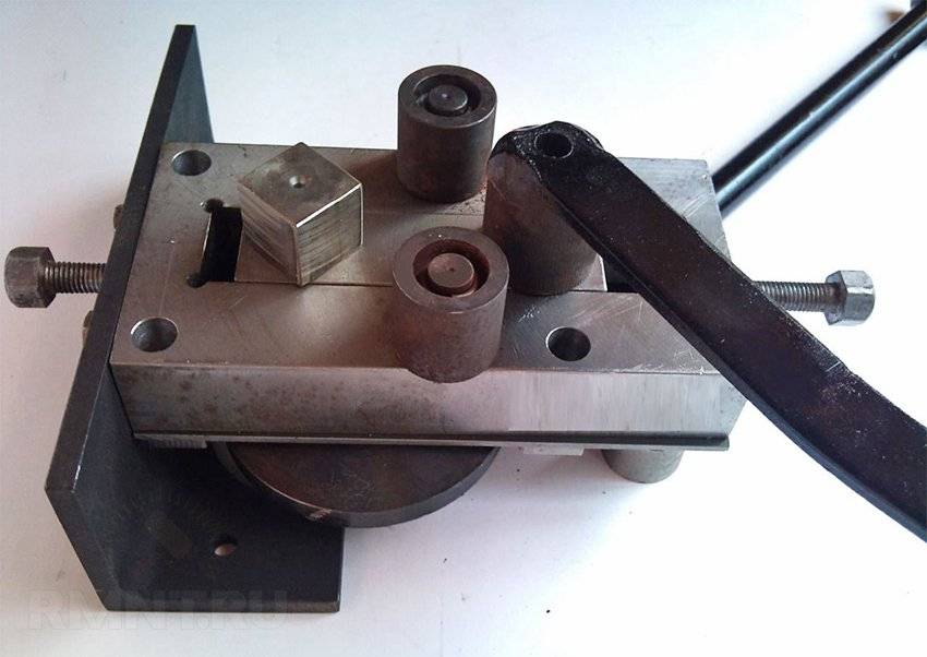 Конструкция гибочного станка также несложная, однако она содержит несколько обязательных элементов, сборка которых невозможна без специализированного инструмента. Основание – массивная металлическая пластина с пазом посередине, в который вставляется подвижный упор, перемещаемый червячным механизмом. Два других цилиндрических упора неподвижны и крепятся на основание с двух сторон симметрично относительно паза. Именно монтаж упоров может вызвать затруднение, так как отверстия под крепеж сверлятся только на специализированном станке, воздействию дрели такая заготовка из высокопрочной стали не поддастся.