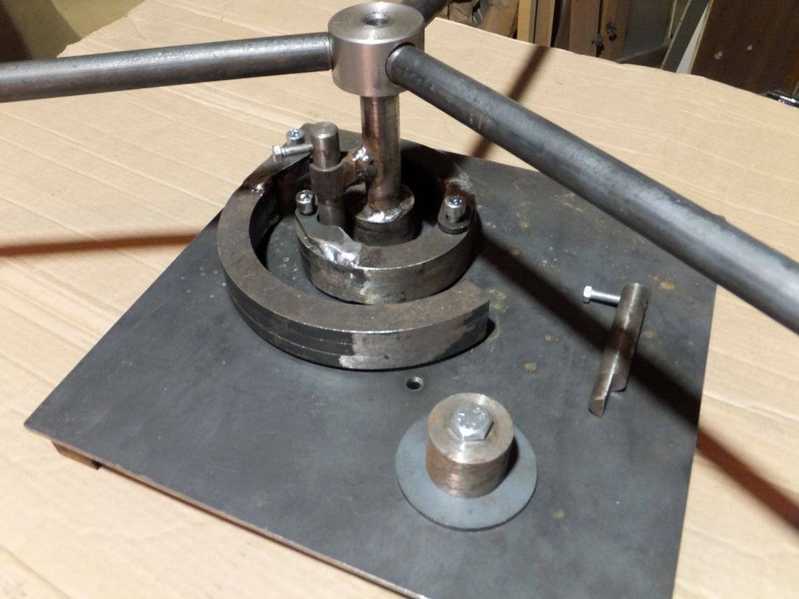 К стальной пластине из листа толщиной не менее 3мм приваривается по центру труба диаметром от 30 мм. Рядом крепится центральный упор для фиксации начала заготовки. Затем к ней приваривается металлическая полоса, шириной равная обрабатываемой детали, изогнутая спиралью под необходимым углом.