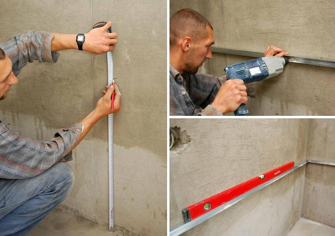 Для начала подготовьте стену. Она должна быть максимально ровной, чтобы плитка не пошла «волнами». Старое покрытие придётся удалить, она хорошо садится только на дерево, гипсокартон. Кстати, укладка плитки на гипсокартон в ванной в данном случае — один из лучших вариантов.
