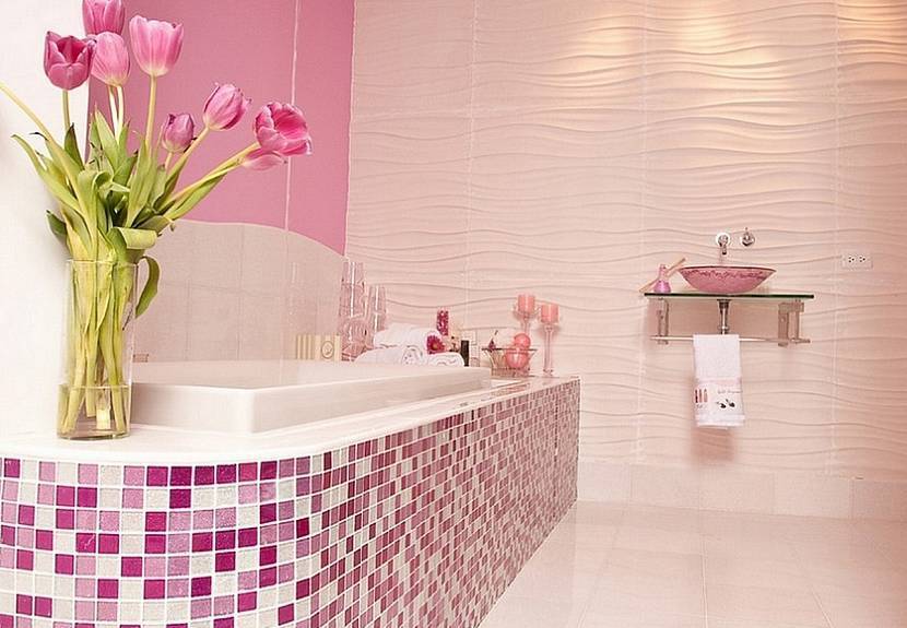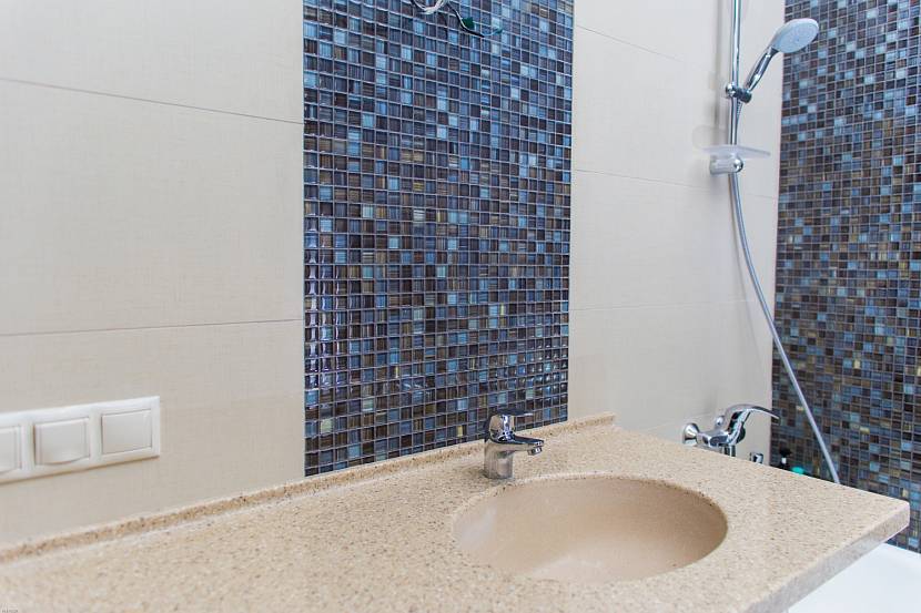 В помещениях с высокой влажностью (сауны, бассейны, спортивные комплексы, душевые комнаты) часто применяется мозаичная смесь. Для декорирования ванн необходимо использовать клей с влагостойкими характеристиками. Отделочный материал универсален, прост в укладке. Можно варьировать контрастность цветовых сочетаний под дизайн помещения.