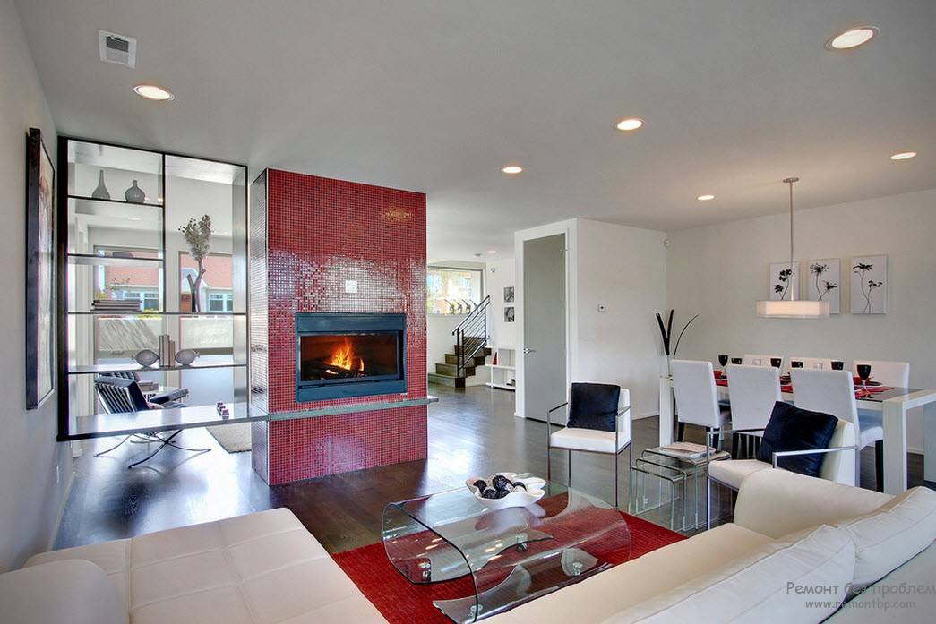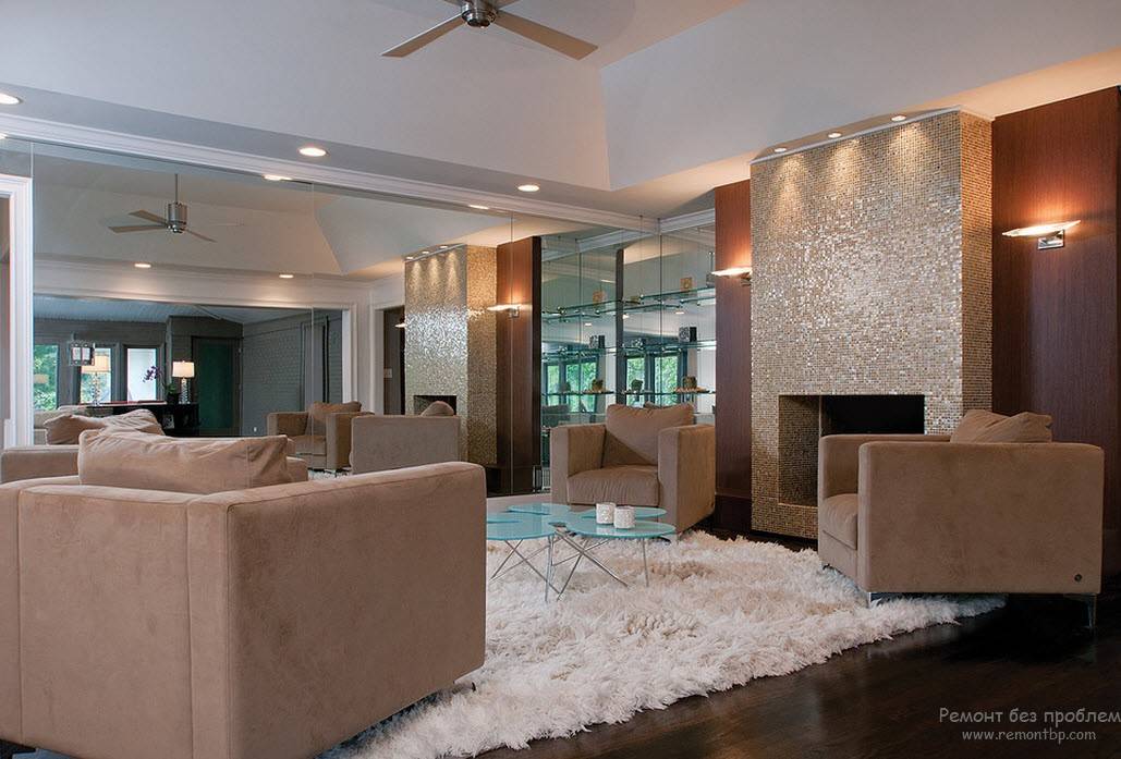 В гостиной можно создать мозаичное панно, отделать цетным стеклом камин или его имитацию. Если в квартире очень любят комнатные растения, то можно сделать зелёный уголок и оформить его мозаикой. Эффект потрясающий!