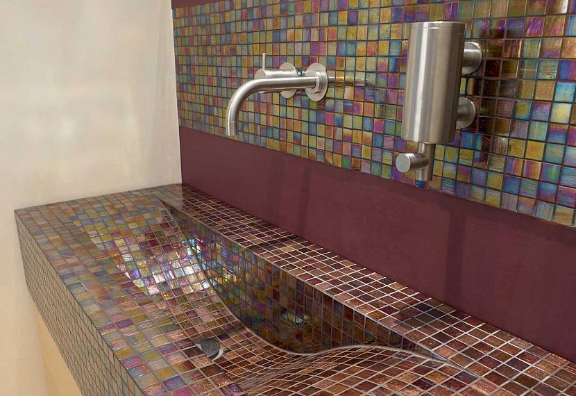 Стеклянная мозаика благодаря своему качеству водонепроницаемости широко используется в отделке ванных комнат. На стенах создаются оригинальные изображения из цветного стекла, которые переливаются на свету и играют новыми красками от капелек воды. Поскольку стекло скользкое, то в ванных на полы такую мозаику лучше не класть.