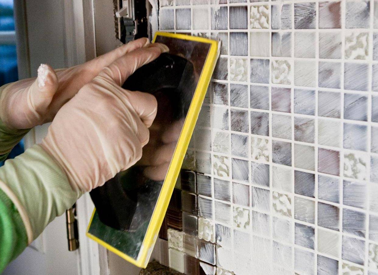 На первом этапе стена должна просохнуть в течение суток. Затем снимают остатки клея, а швы между кусочками мозаики обрабатывают специальной кафельной затиркой, которую также удаляют после высыхания. Эти действия удобно выполнять мягкой влажной губкой.