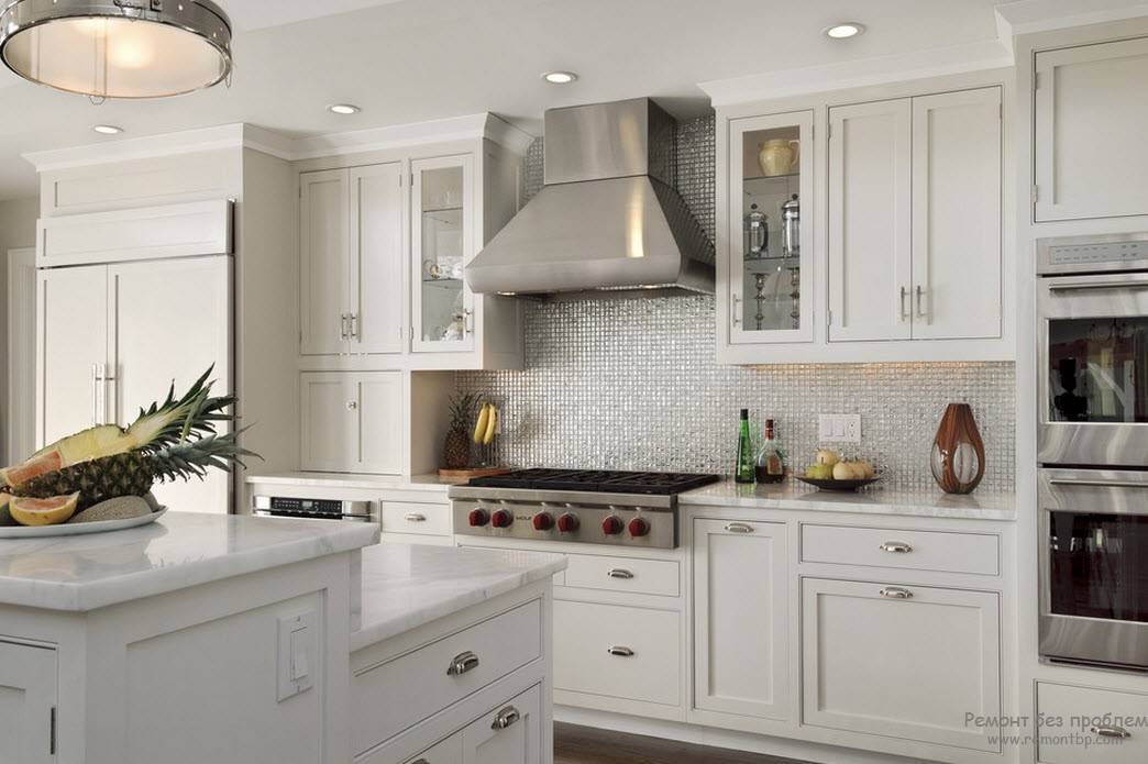 Интерьер классической белой кухни можно дополнить фартуком в ярких тонах. Элемент декора может соединять цвета предметов мебели, светильников, посуды, текстиля. Возможно создание художественного изображения из стекла, перламутра, которое станет ярким акцентом интерьера.