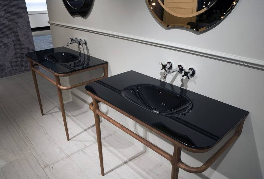 По способу крепления | Изделия крепятся только на специальных декоративных кронштейнах или на подставках. В качестве подставок могут использоваться вертикальные ножки или верхние поверхности оригинальных тумбочек. Количество технологических отверстий в стеклянных раковинах минимизируется, для фиксации изделия часто применяются вакуумные присоски. Вариантов фиксации непосредственно к стене не существует – это один из недостатков. Он ограничивает варианты установки раковин в помещениях. |