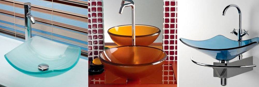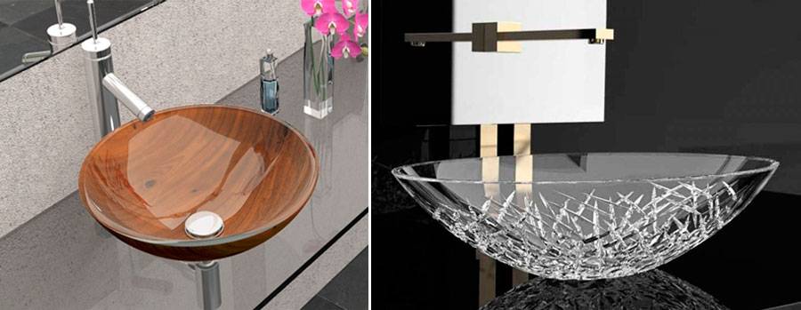 Стеклянные умывальники, как правило, имеют различные формы и узоры. Они могут быть идеальной геометрической формы, полукруглыми, овальными, квадратными и прямоугольными. Некоторые модели принимают форму необычных чаш или мисок. Прозрачность материала требует от дизайнеров и производителей совершенства отделки, потому что каждый дефект виден сразу.