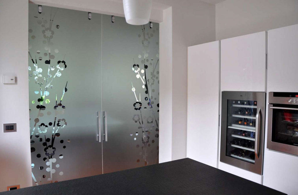 - Большое количество вариантов внешнего вида. Стекло прозрачное, матовое, декорированное, цветное. Кроме того, на стекло можно наносить фотопечать, пескоструйную очистку, приклеивание узорчатых пленок и т.д.