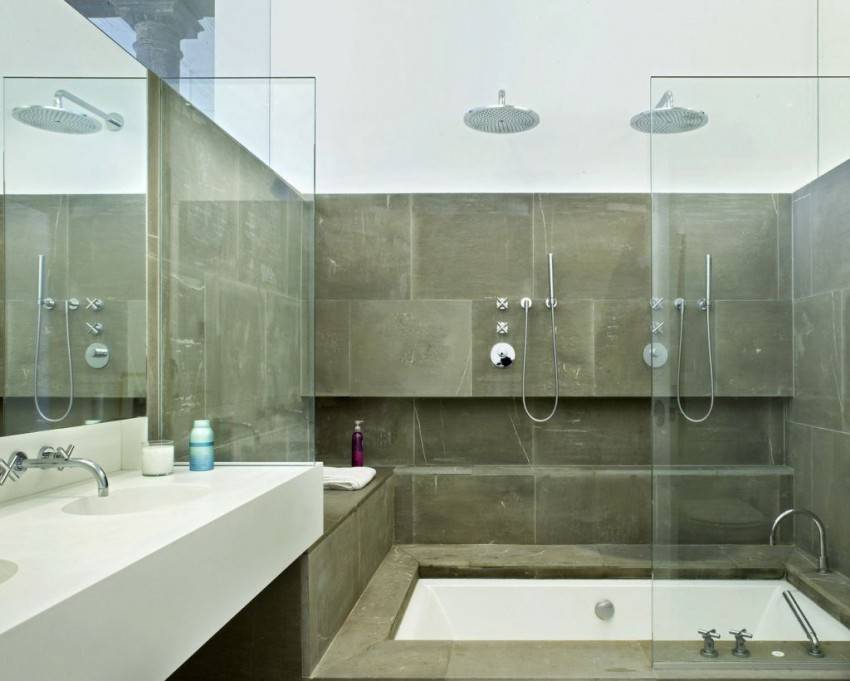 Комбинирование прозрачного и тонированного стекла при возведении перегородок в ванных комнатах позволяет создать не только функциональную защиту помещения от влаги, но и украсить интерьер, привнести элемент оригинальности.