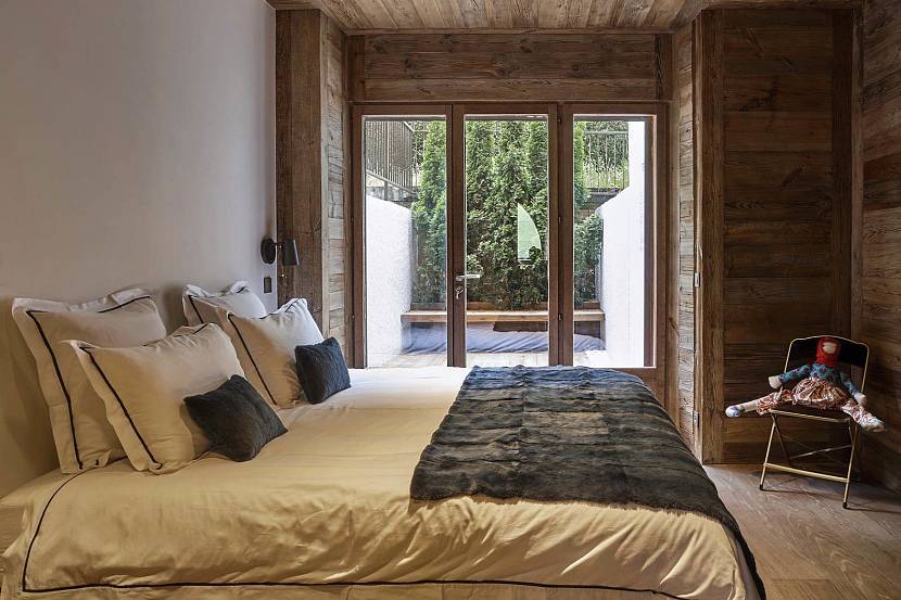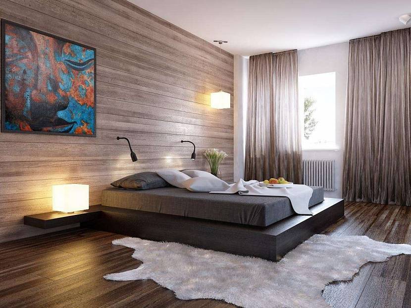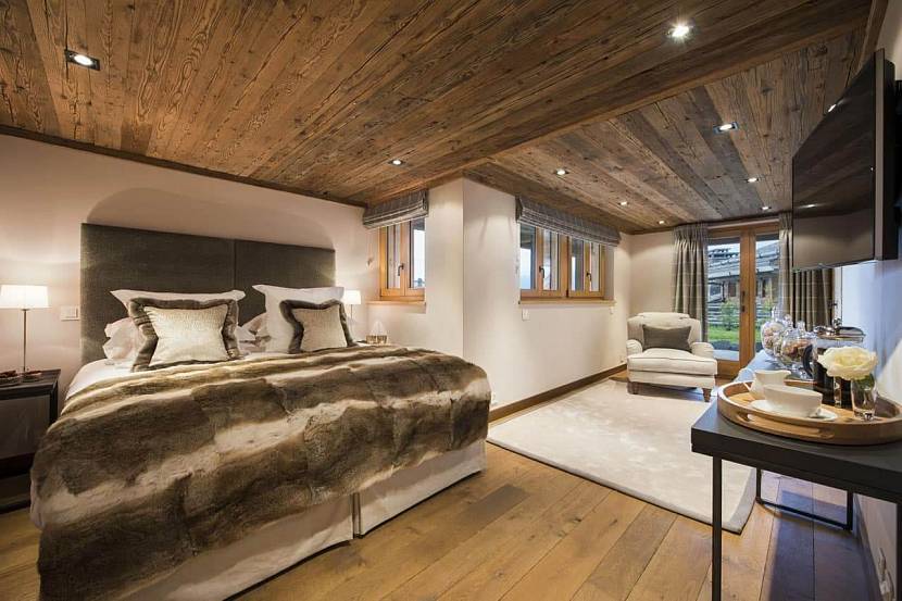 При упоминании стиля шале в воображении сразу появляется просторное помещение с балками на потолке, большими окнами, теплыми коврами и обилием деревянной мебели простых форм. Этот стиль отлично вписывается в убранство загородного дома. В спальне, как правило, только самая необходимая мебель, а вместо ковра можно использовать интересную деталь – шкуру животного.