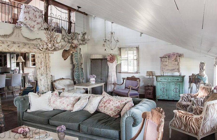 Сформировалась манера декорирования жилища вещами подержанными, выцветшими и даже дефектными, но при этом качественными. Цветовая гамма: кипенно-белый, цвет слоновой кости, нежно-розовый, светло-голубой, патина. Пол – состаренный паркет. Декор: старинные часы, граммофоны, вазы, канделябры, телефон под старину, различные мелкие предметы прошлых эпох, хоть ржавый утюг на углях. Оживляют такой интерьер цветы, но опять же в состаренных горшках или даже деревянных ящиках. Такой дом вызывает желание вязать, раскладывать гербарий, читать долгую, долгую книгу в потертом кожаном переплете и никуда не спешить.