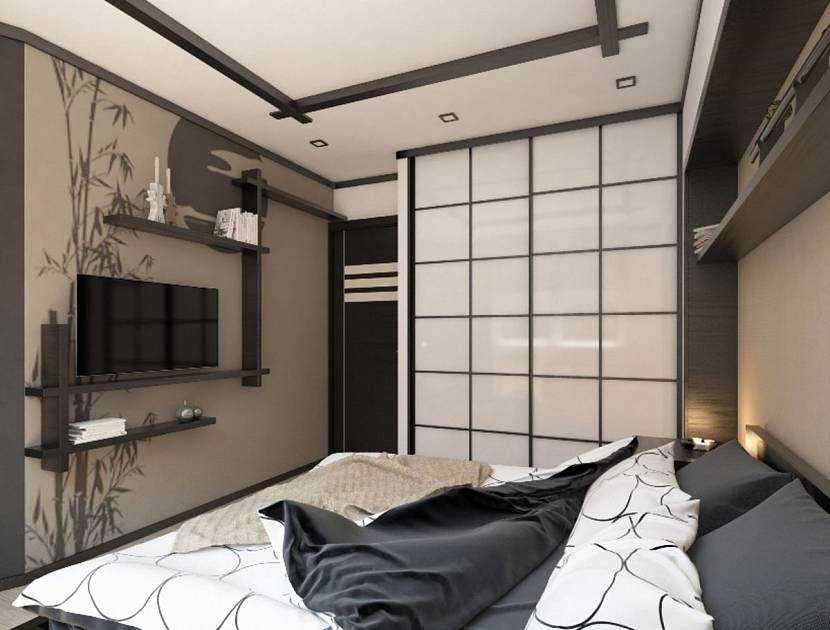 Для стиля характерно сочетание простых элементов в природных цветах и обилие натуральных материалов. Все здесь говорит о единении с природой. Интересный эффект помещению придают яркие аксессуары и характерные для востока узоры. Одной из традиционных деталей японского стиля можно считать ширму, с помощью которой легко зонировать помещение и отделить кровать от окружающей обстановки.