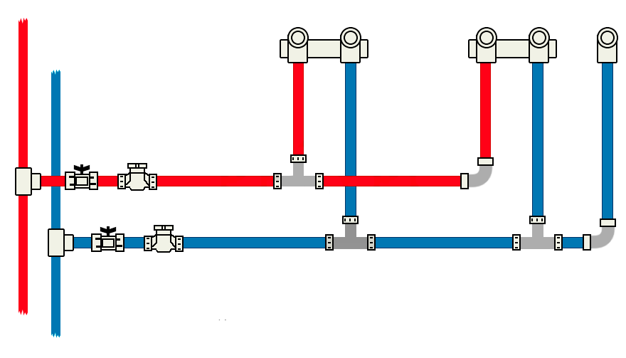 - Диаметр труб для отводов к водорозеткам должен быть меньше диаметра магистрали. Например, если магистраль d20, то отводы должны быть d16.