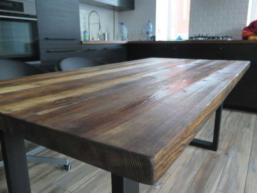 Стол из деревянного бруса хорошо смотрится вместе с массивной столешницей. Если сделать её из цельного куска дерева проблематично, её клеят из отдельных частей. Таким образом, можно изготовить поверхность любой формы. Применение полимерных мастик позволяет оставлять прозрачные участки, в которых размещают подсветку, различные предметы или даже любимые фотографии.