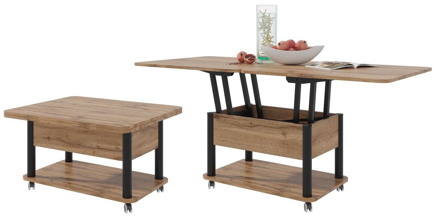 - Журнальная модель отличается небольшой высотой, поэтому суть трансформации в данном случае заключается в подъеме столешницы. Наиболее доступными в этом случае будут изделия с подъемной столешницей на металлических выдвижных стержнях. Очевидно, что в разложенном состоянии такие модели выглядят не очень эстетично.