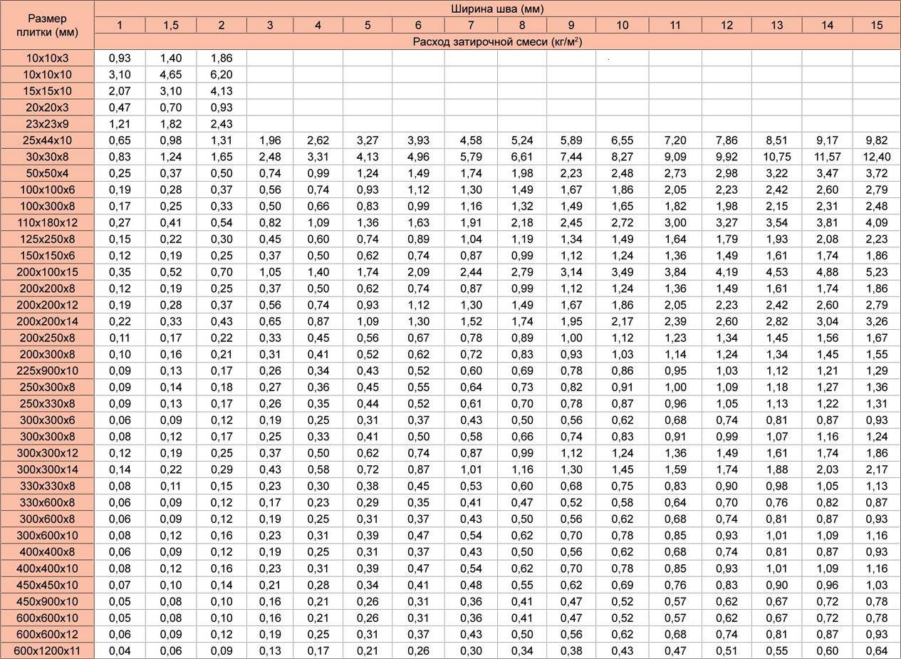 Вся поверхность грунтуется перед укладкой плитки. После высыхания грунтовки наносится плиточный клей зубчатым шпателем, а потом уже выкладывается сама плитка. Потом нужно будет затереть швы. Для этого используется специальная затирочная смесь. Узнать, сколько такой смеси понадобиться в зависимости от размера плитки и ширины шва можно из таблицы.
