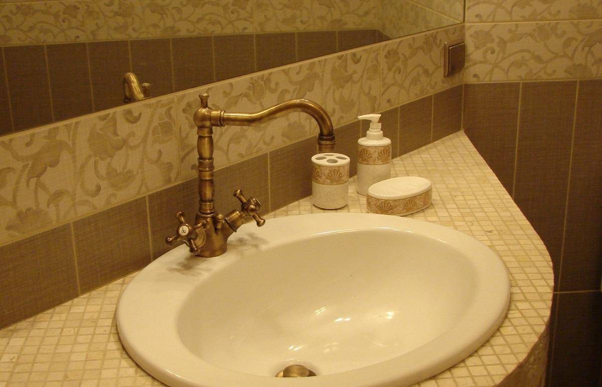Раковина из мозаики хорошо смотрится в интерьере ванной комнаты, сделанной в классическом стиле