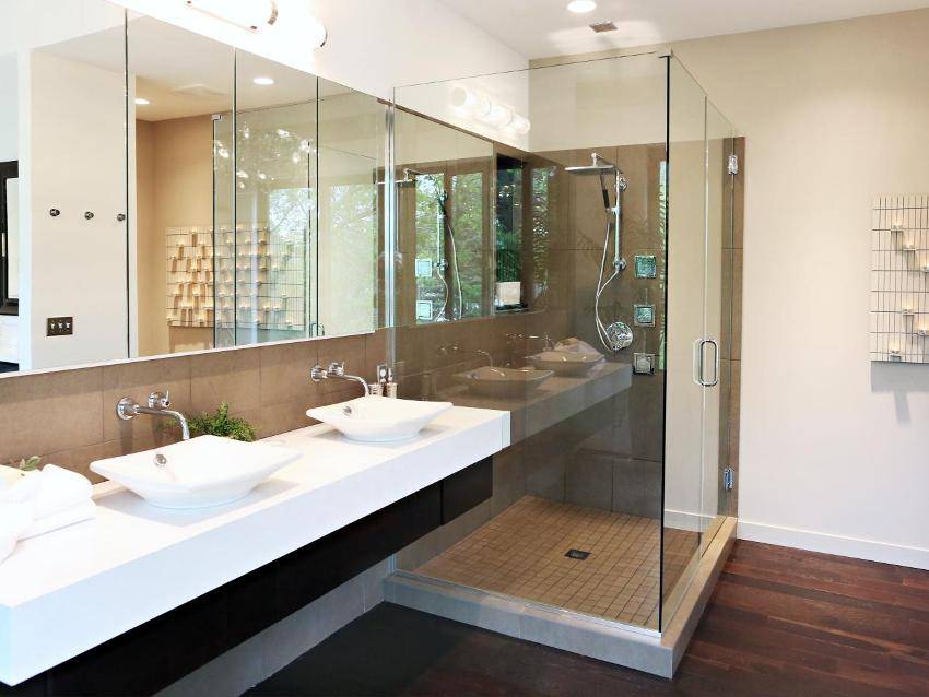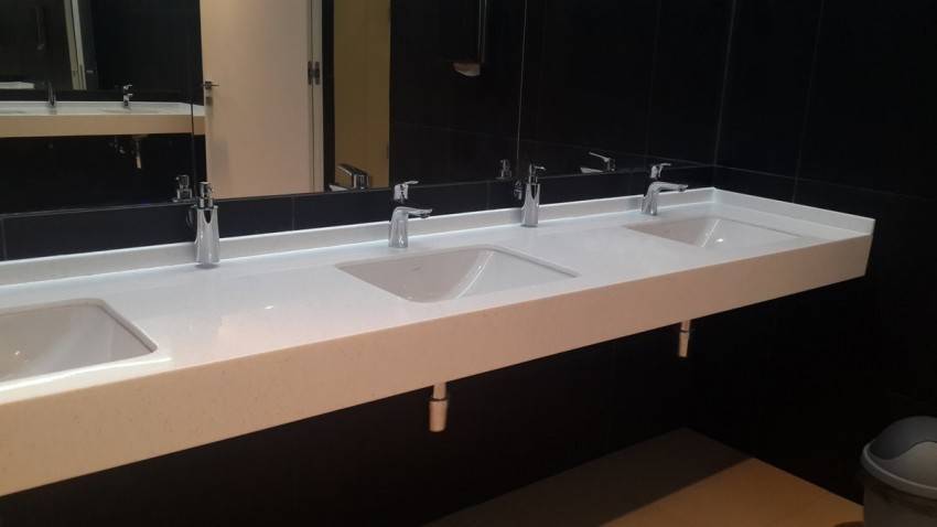 В интерьере ванной комнаты может размещаться больше одной раковины, например, в общественных местах в одну столешницу монтируют две, три и больше раковин. Единая поверхность создает целостное впечатление и облегчает процесс уборки.