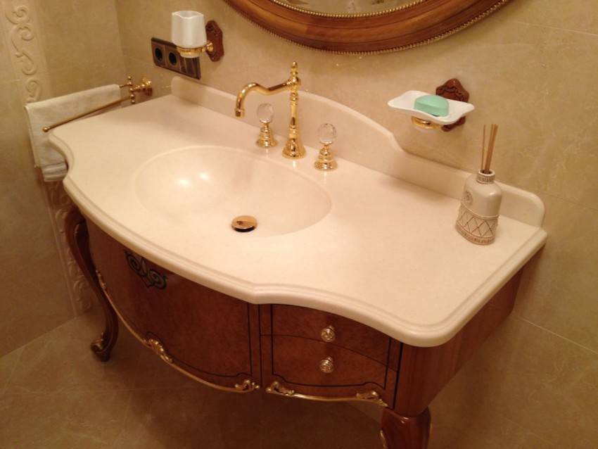 Столешница для ванной комнаты под раковину изготавливается из различных материалов: