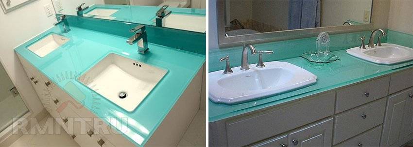 Стеклянные столешницы продаются в комплекте с раковинами, так как стекло нельзя самостоятельно «подогнать» под нужные размеры. Такие модели выглядят изысканно и стильно, устойчивы к царапинам, не боятся моющих средств и плесени. Существенный плюс — доступная цена.
