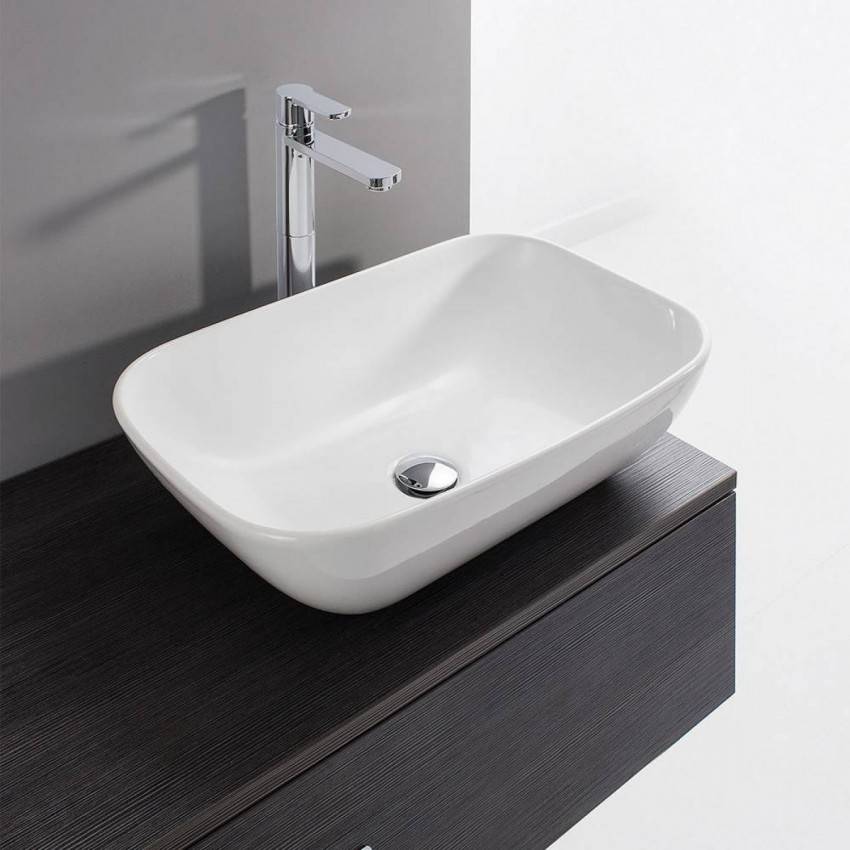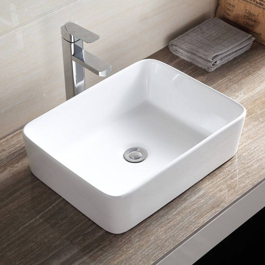 Раковина прямоугольной формы имеет стильный внешний вид. Как и в большинстве случаев для изготовления конструкции используется сантехнический фаянс. В центральной части расположено отверстие под смеситель. Для перелива разъем не предусмотрен. Габариты: 40х48х22 см.