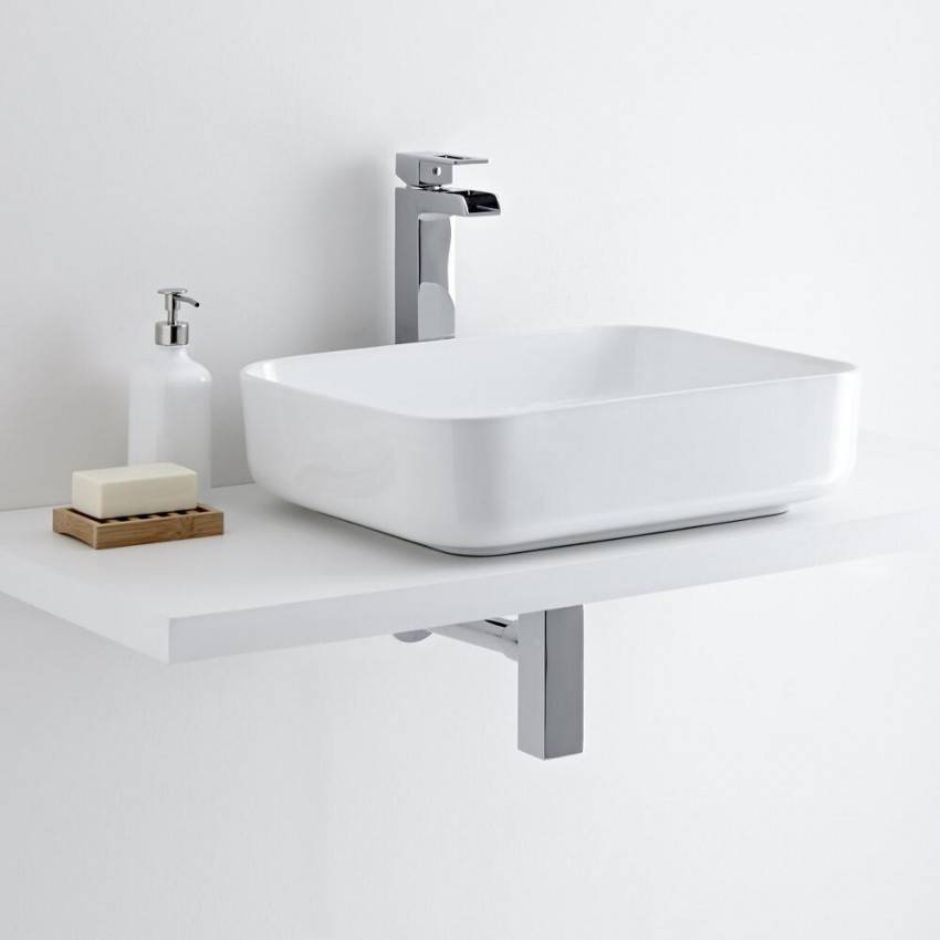 - для накладной раковины отлично подойдет столешница в виде консольной полки;