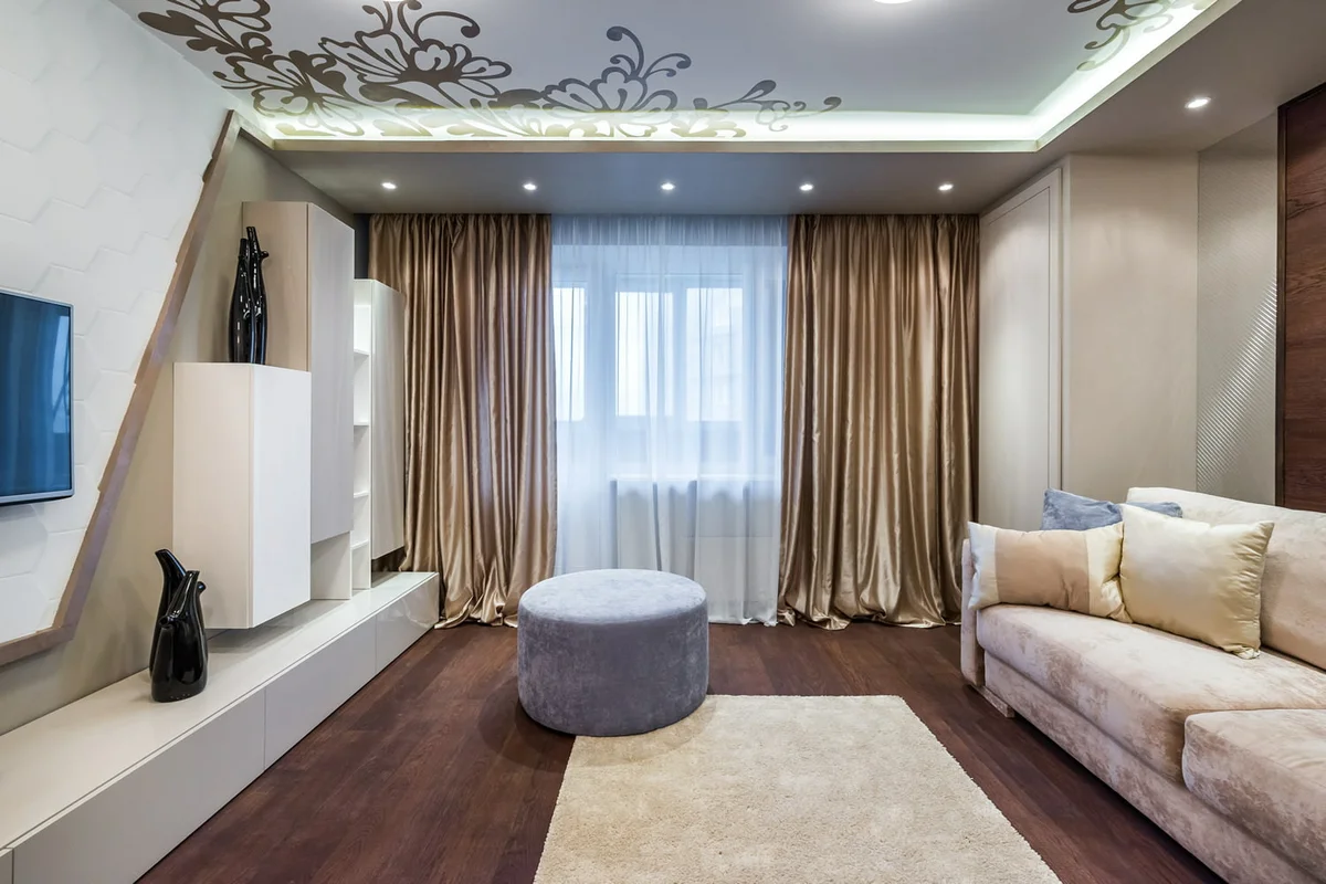 Для гостиной традиционно выбирают наиболее дорогую ткань. Тем не менее, нужно следить, чтобы она не была чрезмерно тяжелой, не загромождала визуально помещение.