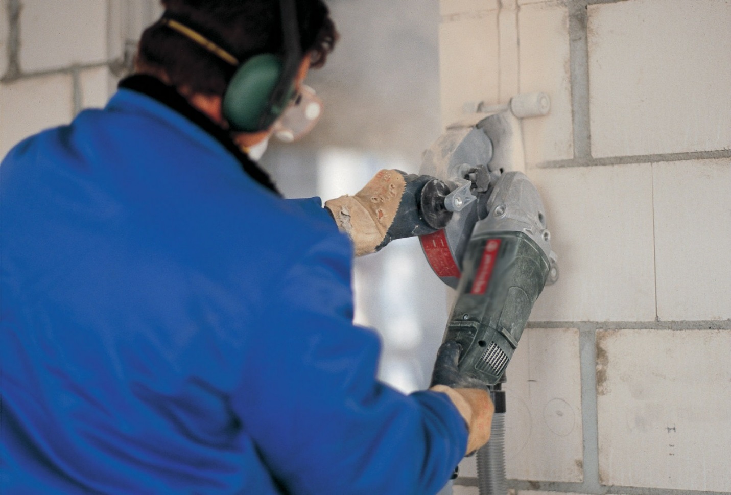 Угловая шлифовальная машина с абразивным кругом позволяет резать различные строительные материалы и не создает ударных нагрузок на перегородки. После выполнения параллельных надрезов центральную часть выбивают зубилом. Недостатками методики являются шумность, пыль, которая попадает в помещение, неравномерность глубины резки и риск срыва инструмента. Некоторые мастера дорабатывают оборудование, устанавливая двойной круг и защитный щиток с патрубком для подсоединения гибкого шланга пылесоса.