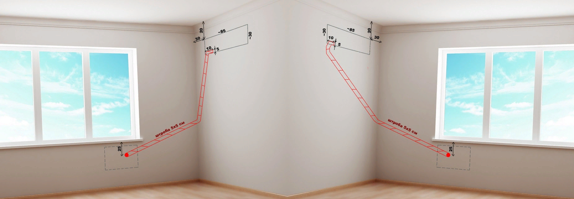 Для установки кондиционера необходимо проделать более габаритные штробы. Они состоят из наружных и внутренних блоков. Ширина штробы должна быть не менее 60 мм, в глубину – 55 мм. В них будут прятаться все утеплительные каналы, провода и гофра, которая используется для вывода конденсирующейся влаги.