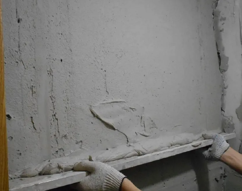 - Чтобы сделать поверхность идеально ровной, желательно использовать маяки. Также необходимо найти и удалить выступающие бугорки и заделать щели.