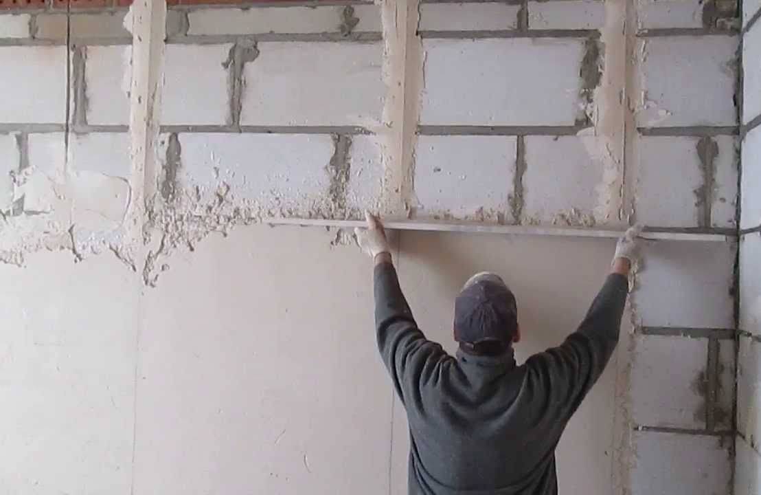 На всю высоту поверхности устанавливают маяки. Ширина между деталями должна быть меньше характеристик правила на 30 см. При выравнивании профессионал перемещает конструкцию в форме зигзага, траектория которого выходит за пределы деталей.