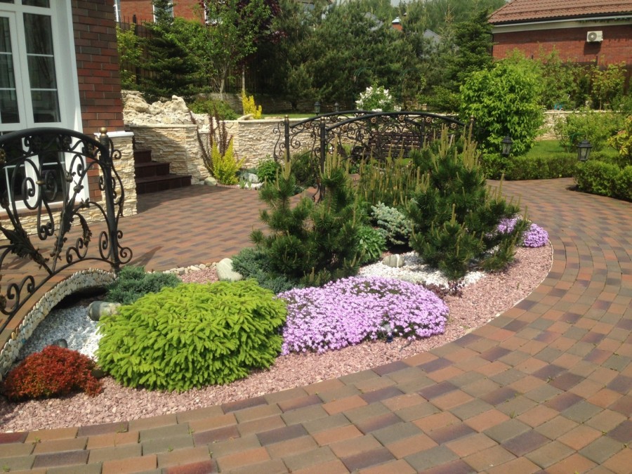 - Сухой ручей с декоративным мостиком — строится возле ниспадающих деревьев или на открытой местности.
