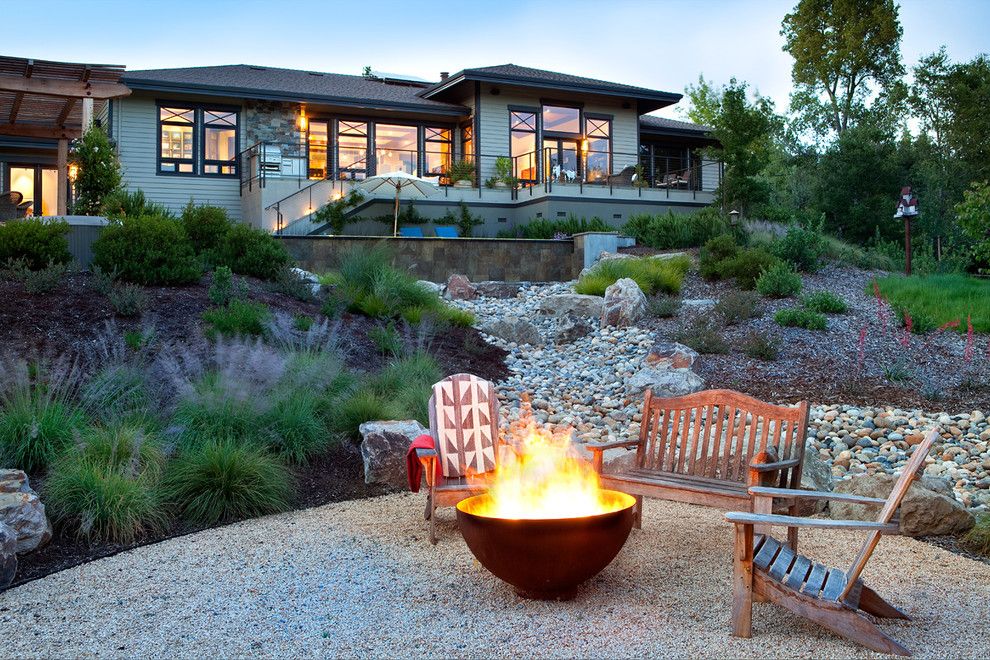 Планируя элементы для сухого ручья, ориентируйтесь на то, насколько гармонично они будут смотреться с имеющимися объектами на участке