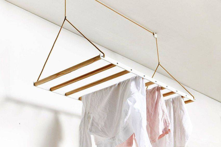 - приспособление делается из каркаса и веревок, которые протягиваются через перекладины, где сушится белье. Штанги можно подтянуть к самому потолку;