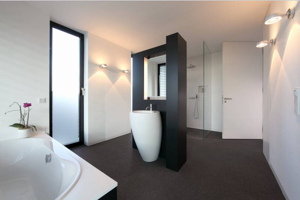Для ванных, выполненных в современном дизайне, используют встраиваемые точечные светильники (“глазки” или “таблетки”). С их помощью легко зонировать освещение, кроме того, они соответствуют всем действующим требованиям пожарной безопасности и имеют достаточный уровень защищенности. Встраиваемые светильники для ванных комнат рекомендуется использовать непосредственно над ванной, поскольку именно в этом участке помещения скапливается наиболее влажный воздух. Влагозащищенные светильники этой категории выпускаются в самых разнообразных вариантах дизайна, от классики до модерна, что позволяет достаточно легко вписать их в интерьер ванной комнаты.